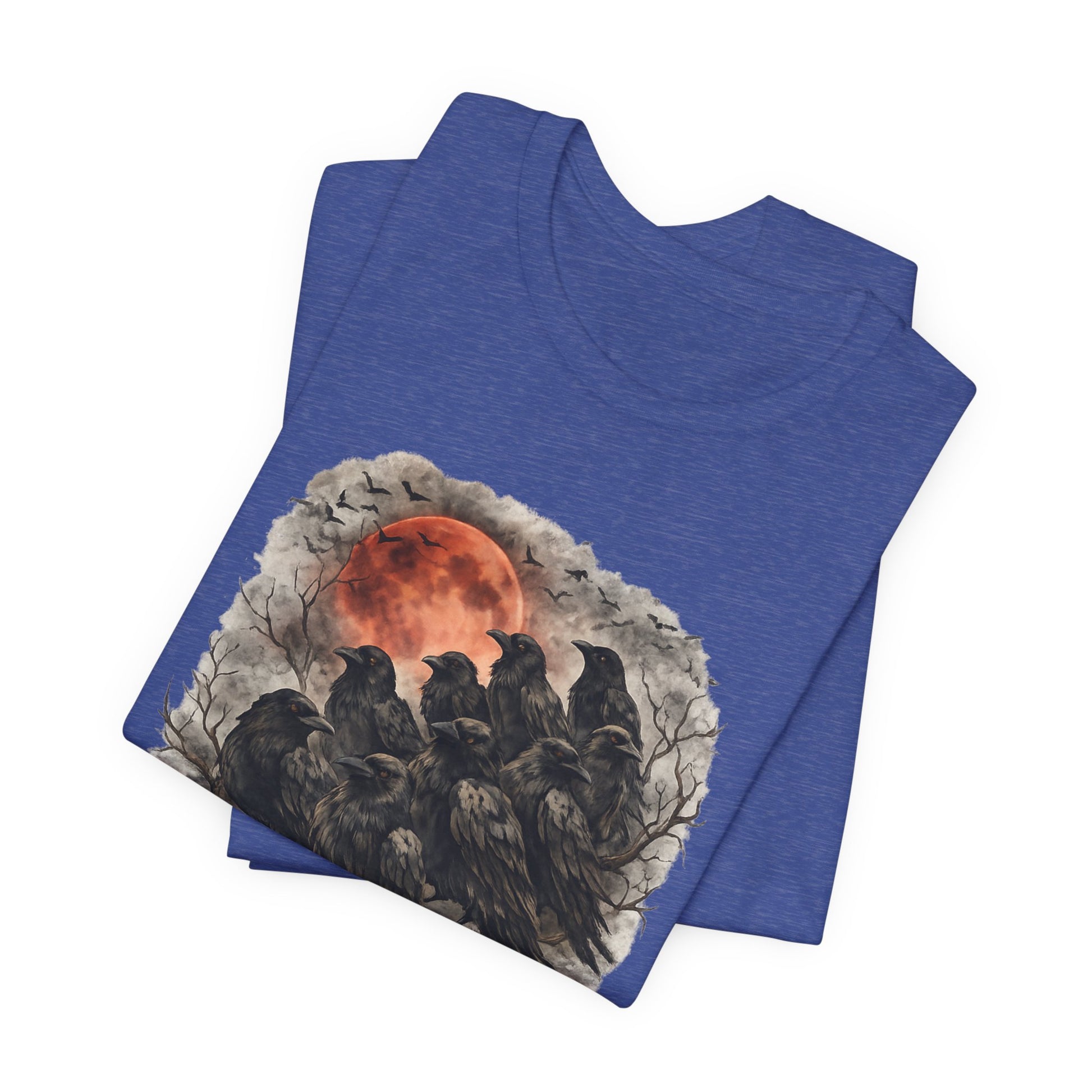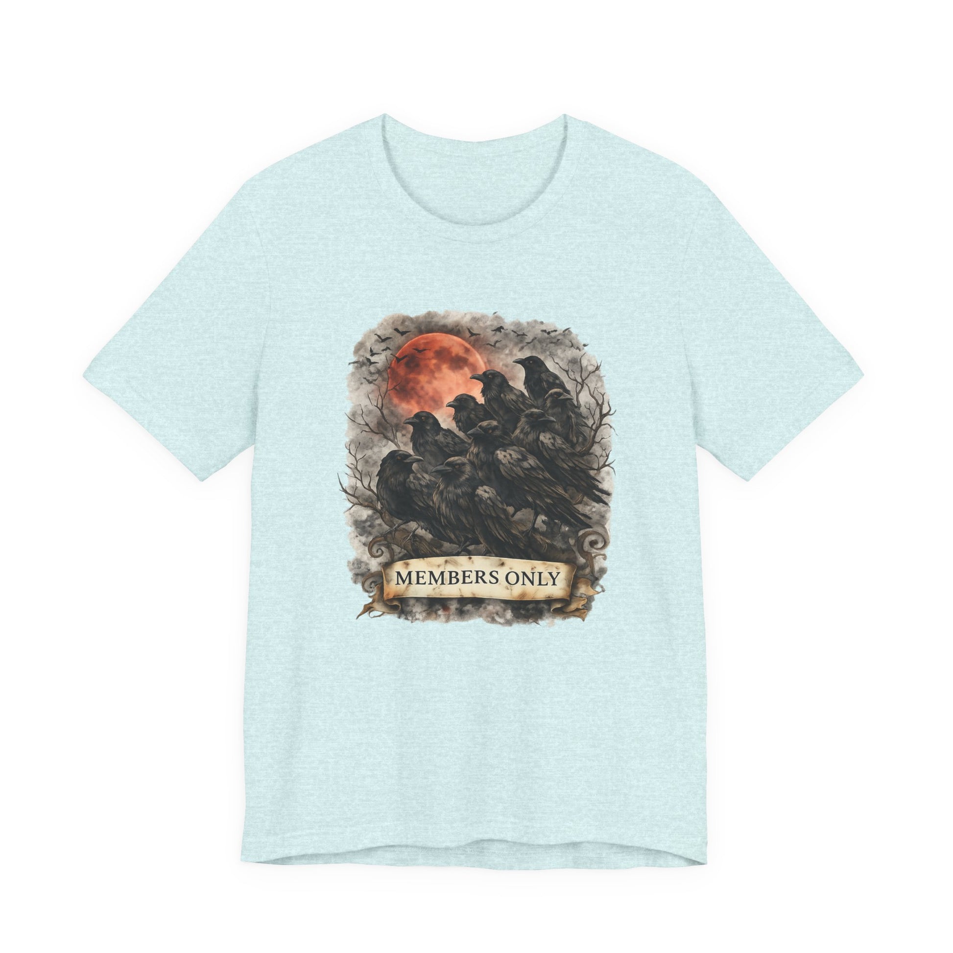 This lightweight jersey tee carries a dark, atmospheric illustration—a cluster of watchful crows beneath a blood-red moon with a worn “MEMBERS ONLY” banner—woven into everyday wear. The soft, breathable Airlume combed cotton feels gentle against skin and layers easily under jackets or over long sleeves. Side seams and shoulder tape keep the shirt’s shape through repeated wear, while the ribbed crew neck holds its form for a clean, finished look. The design reads like a secret emblem for night wanderers and lore lovers; it sits confidently on the chest without overpowering your outfit. Ethically produced and REACH certified, this tee blends a moody, story-driven graphic with thoughtful construction for lasting comfort and character.